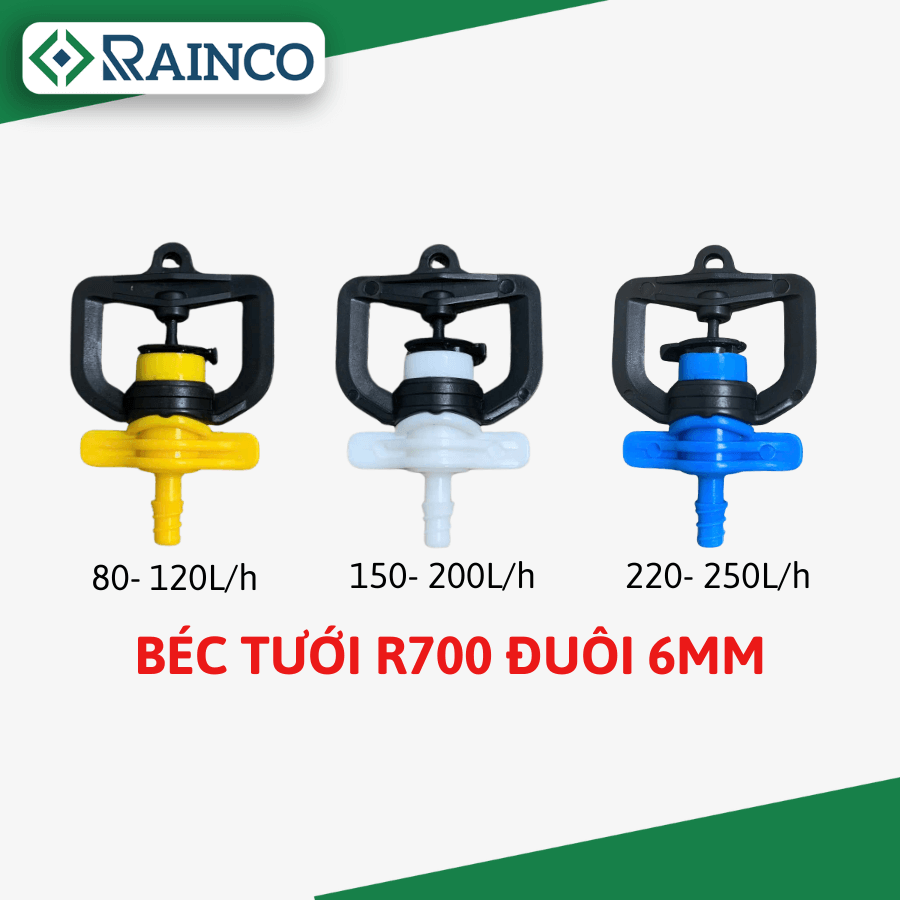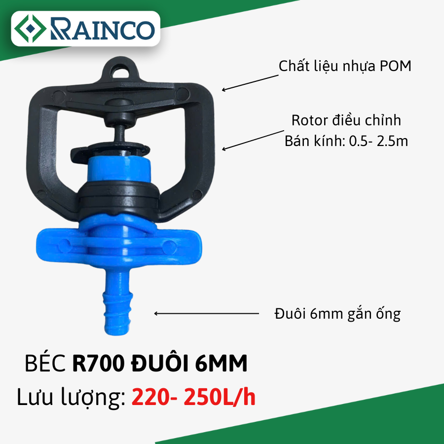 - Béc tưới phun mưa R700 đuôi 6 ly được làm từ chất liệu nhựa POM.