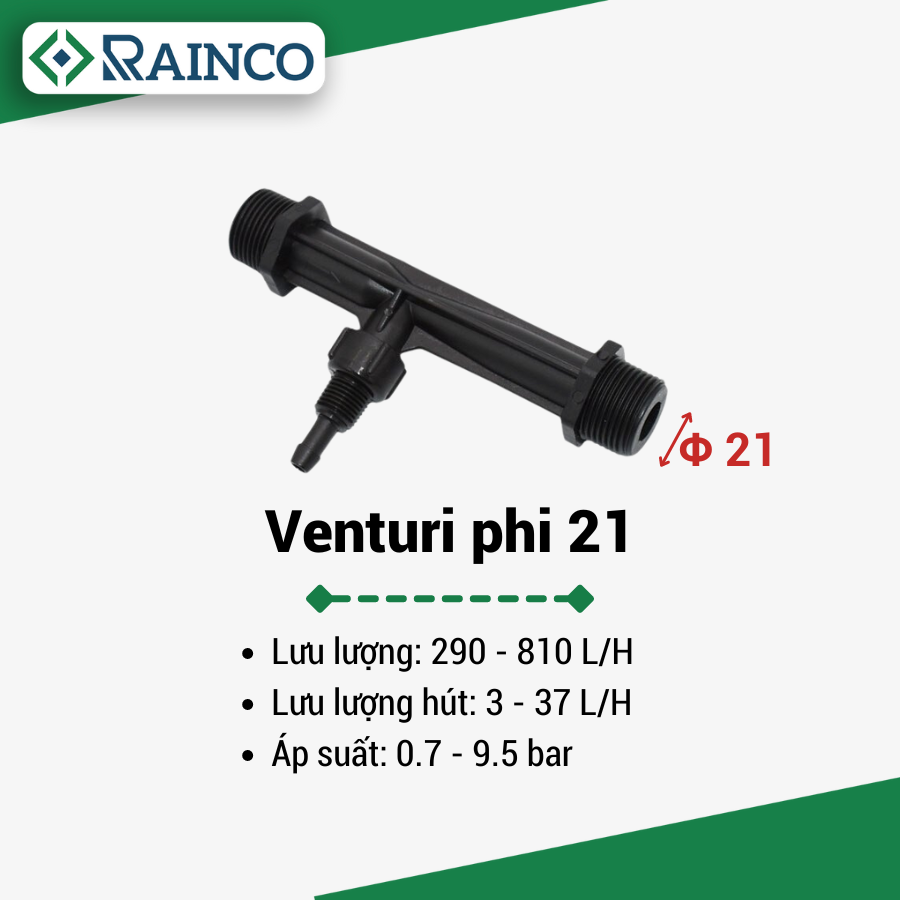Venturi là một thiết bị châm phân được thiết kế đơn giản có tác dụng chính là đưa phân bón hòa tan từ bồn chứa vào đường ống chính để đến đường ống nhánh của hệ thống tưới để cung cấp dinh dưỡng đến cây trồng thay thế cách bón phân truyền thống. Được thiết kế cải tiến để điều tiết chất dinh dưỡng như: phân, đạm, thuốc bảo vệ thực vật để tưới cho các cây trồng rau ăn lá, cây ăn quả với quy mô lớn, hệ thống nông nghiệp quy mô rộng.